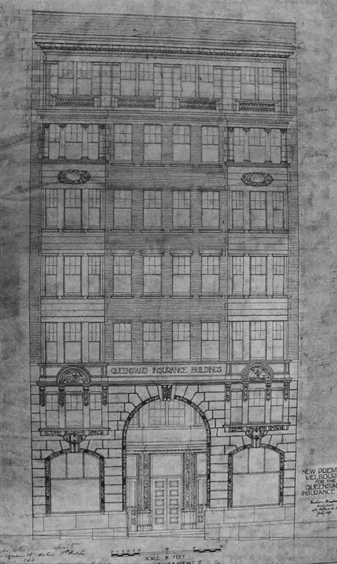 The Queensland Insurance Company had hoped that its new building would help stimulate business for its Melbourne branch, which had been underperforming for several years. Butler & Bradshaw designed a seven-storey building, plus basement, for the insurance company; its façade inspired by Renaissance palazzo (palace) design. The façade of a palazzo has three distinct elements: base and attic levels that are heavily ornamented, and intermediate floors faced with less decoration. The Queensland Building is one of a number of buildings designed in this manner including Centreway Arcade (1911) and the Auditorium Building (1913) in Collins Street, and the Commercial Travellers Association Building (1913) in Flinders Street.