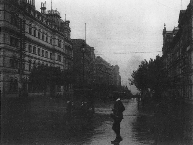William Street, Melbourne c1913. The Queensland Building, partially visible right of centre, is the tallest building in this block between Bourke and Collins Street. (City of Melbourne Art & Heritage Collection)